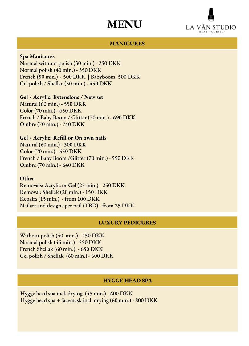 800 DKK Daisy NemethTrustindex verifies that the original source of the review is Google. 10/10 Would (and will) do again. Their prep work on the nails is fantastic. Their pedicures are especially fantastic - great prep and massages. My new go to. Mani KorotaniaTrustindex verifies that the original source of the review is Google. Being from London and visiting Copenhagen for the first time for work, I was in need of getting my nails refreshed. I stumbled across La Vân Studio on a google search and saw images of their work. I booked in for an appointment which was so quick and easy. When I arrived for my appointment, I was taken aback at how beautiful the decor and vibe was in store. I was booked in with Tram, who delivered exceptional service from the start, an early morning appointment meant I needed a coffee to kick start my day and nothing was too much for her! After my coffee fix, she went on to do an amazing job with my nails! I am so impressed and extremely happy with how they turned out! 100% would recommend this studio to anyone in Copenhagen looking to get their nails looked after! JennieTrustindex verifies that the original source of the review is Google. I went to La Van Studio for a hair spa and it was amazing! It’s a Vietnamese-style hair wash, but what surprised me the most was how they also massaged my shoulders, neck, and even feet. The scalp treatment felt so relaxing, and the hair treatment results were incredible. My hair came out fluffy yet super smooth and soft. They also used facial products during the treatment, and my face was literally glowing when I walked out. The staff were super friendly and the place has such a relaxing vibe. Walked out feeling refreshed and pampered. Highly recommend! Christine StefaniaTrustindex verifies that the original source of the review is Google. After every appointment I walk out with the biggest smile on my face, top service, sweet staff and the prettiest nails in town!! Highly recommend for your next selfcare treatment🫶🏽 Caterina SquarciaTrustindex verifies that the original source of the review is Google. I had an amazing experience at La Van! The salon is pretty and very clean, the staff is always smiling and very kind, and my pedicure turned out very nice. The pedicure chair even had a massage feature you could control, and I was brought tea in the meantime. 100% recommended! Sara StougaardTrustindex verifies that the original source of the review is Google. Altid vildt søde og fleksible med tid - og kan lave nærmest alt, du ønsker. Har haft billeder af ret komplicerede designs med som inspiration, og det er blevet udført perfekt! Og så holder neglene seriøst for evigt!! Katie DTrustindex verifies that the original source of the review is Google. La van studio popped up as a highly rated nail salon so I decided to try it out. Even though I didn’t have an appointment, they were able to accommodate a manicure. I love how my nails came out, and I appreciated the care they took in making my nails look beautiful. I will visit again next time I am in town. Eva GaudetTrustindex verifies that the original source of the review is Google. Very nice location for good quality and price 🫶 it’s my second time here but I will definitely come back. PS : The owner is so sweet ! Katerina ZujevaTrustindex verifies that the original source of the review is Google. I went here while I was visiting Copenhagen and the service was incredible. Great shade range to choose from and the staff was lovely; overall amazing experience and highly recommend. The salon was very professional and catered towards all my needs! Chiara AmorevoliTrustindex verifies that the original source of the review is Google. I didn’t like the way they left me there without telling me anything, and one of the nails was not ready. For the price a bit disappointed.